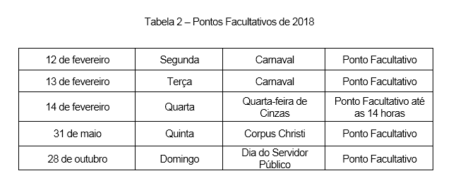 A Portaria nº 468 divulgada pelo Ministério do Planejamento e publicada no Diário Oficial da União do dia 26 de dezembro de 2017, estabelece o cronograma de feriados nacionais e de pontos facultativos no ano de 2018. As datas deverão ser observadas pelos órgãos e entidades da Administração Pública federal direta, autárquica e fundacional do Poder Executivo, sem comprometimento das atividades públicas consideradas como serviços essenciais à população.