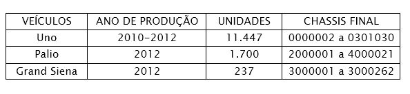 A montadora Fiat anunciou nesta quinta-feira (11) o recall de 13.384 unidades dos modelos Uno, Palio e Grand Siena pela falha que ficou conhecida como "airbags mortais" da fabricante japonesa Takata. A companhia é fornecedora de grandes montadoras, como as japonesas Honda, Toyota, Nissan, Mitsubishi, Mazda e Subaru, além de BMW, Ford, General Motors e Fiat Chrysler. A falha foi anunciada pela Takata em 2013, quando começaram os recalls.
